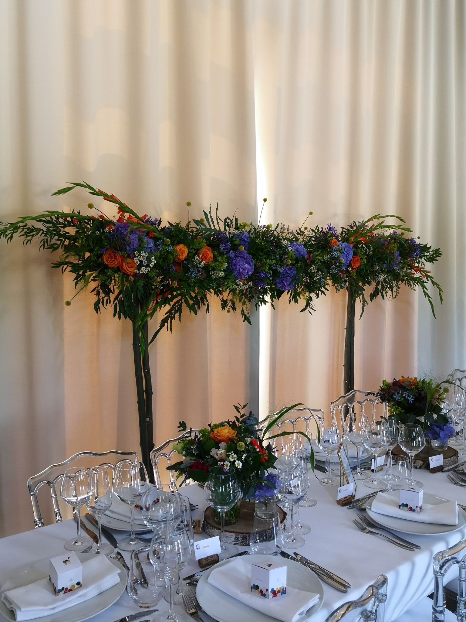Nous nous proposons donc aussi de réaliser des éléments de décor, pour sublimer le lieu que vous aurez choisi pour célébrer votre union. Arche végétale, décorations de bancs, centres de table, paravents fleuris et lustres naturels viendront habiller une église, un restaurant, une salle de réception ou encore un extérieur.