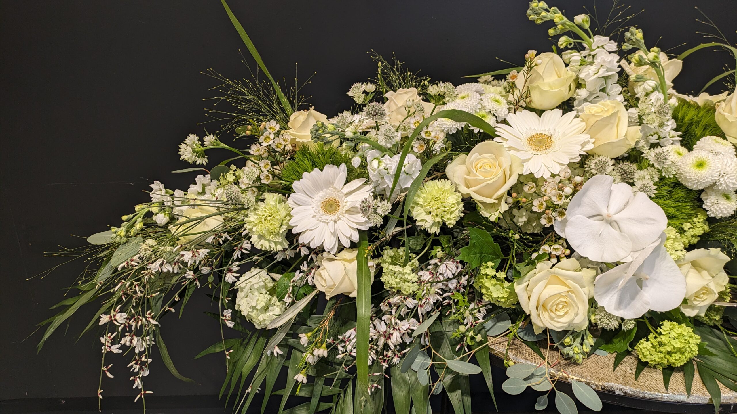 Un hommage sobre et respectueux pour exprimer vos condoléances dans les moments difficiles. Composée avec sensibilité par nos artisans fleuristes, cette création élégante offre réconfort et soutien à ceux qui traversent le deuil. Chaque fleur est choisie avec soin pour transmettre un message de sympathie et d’espoir en cette période de tristesse.